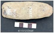It is a broken tool which has been mended to give it s a complete shape. Both the sides are hafted with regular intervals. The working edge is fairly preserved with hardly any use marks. Most possibly the tool was not used extensively.