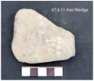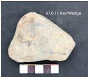 Roughly ground on both the faces retaining flake scars. Ventral face is slightly convex. Dorsal remains flat. The right margin is smooth and roundish. The left margin is retouched by alternate flaking. The edge is median and concave.