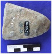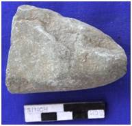 A small axe made by flaking with patches of cortex on both the faces. One margin is thick and convex with marks of flaking. The other margin is moderately thin. Butt is made thin with an arched poll which is partly broken. Concavo-convex in median and longitudinal cross sections.