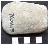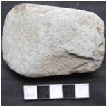 Roughly ground on the surface with a convex ventral and flat in the dorsal face. The margins are thin and roundish. The edge is convex and blunt. Wide butt with irregular poll. Elliptical in median and longitudinal cross section. The tool is heavily rolled and patinated. The platform is uneven and irregular. The working edge tapers from both the sides.