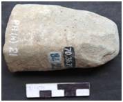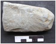 Unfacially flaked and trimmed towards the working edge. The tool retains patch of cortex on the ventral. The ventral is concave. The dorsal remains flat. It has a flat and straight working platform. The sides are trimmed marginally. The tool is highly rolled and patinated. The working edge is blunt.