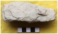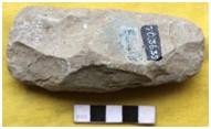 Pre-form of an axe with bifacial flaking. The dorsal is thick and convex and retains big, flat and bold flake scar. Ventral is moderately flat showing small and shallow scars. The margins are thick with tiny steps. Butt is also thick with an irregular poll. The working edge seems to be incomplete with thick, crude and blade like appearance. Median cross section is roughly oval. Longitudinal cross section is indeterminate.