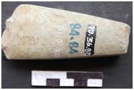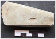 Ground all over retaining a few marks of chipping on the dorsal. The margins are thick, smooth and little divergent. Ventral is convex. Dorsal is flat. Butt is narrow with a rectangular poll. Marks of battering are noticed. Edge is broken. Rectangular in median cross section. Cortex on the ventral. Deep notches on the cutting edge. The platform is flat and straight.