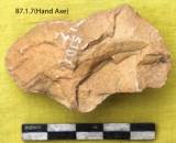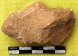 Bifacillay modified. The dorsal is extensively worked with resolved flaking. Big steps all over with one deep scar at the left posterior. Right posterior is thick, little working along the right margin. Ventral has big flat scar on the body. Big longitudinal scars along right margin. An elevation along the posterior. Worked butt and secondary working along right anterior. Oblique, thin and sharp butt. Broadly pointed tip with irregular margins. Triangular median and longitudinal sections.