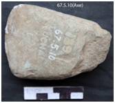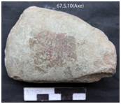 Ground on both the surface with ventral surface convex and dorsal beveled to intersect the upper at the functioning edge which is convex and blunt due to use. Butt is partly broken under the surface, margins are thick, little divergent and pecked. Elliptical in median section.