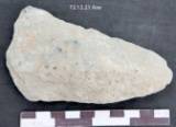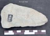 Flaked all over with a central elevation on the under surface. Right margin is thin and concave. Butt is pointed and the working edge is thick with an irregular blade line. Nearly ovoid in median section. Longitudinal margin is biconvex. The tool retains deep flake scar on the left side. The tool is used.