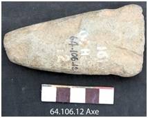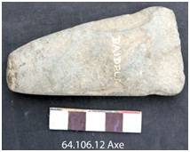 Partly ground retaining bold scars on the faces and the margins. The lateral margin gradually tapers towards the butt. The pole is round flat, broken at the working edge. It is rectangular in cross section. It is slightly plano-convex in the median section which tapers towards the working edge on both the sides.