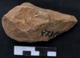 Worked on both the faces. Dorsal is laterally modified retaining a thick mid-ridge from anterior to posterior. But it is reduced by step flaking. Ventral has a big primary scar joining small deep scars at the posterior. Broadly round butt, thin and pointed working edge. Regular margins are visible on both the sides. Plano-convex median section. Non-descriptive longitudinal section. The tool is not rolled but retains used marks on both the working ends.