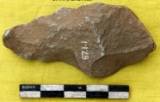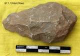 Fully flaked on both the faces. Dorsal has primary flaking. Scars are big and flat. A prominent mid-ridge with thin anterior and cortex on the posterior. Butt symmetrically trimmed retaining small steps. Ventral is flat trimmed along the right lateral and working edge. The tool has a pointed butt and tip which is thin. It has wary margins with plano-convex in median and triangular in longitudinal sections.