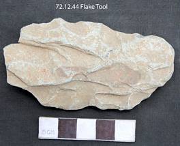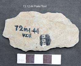 Ventral shows irregular and deep scars. Dorsal shows a flat flake surface with bulb on right side. The tool retains deep and heavy flake scars all over. The sides are notched to prepare cutting edge. The flake is refashioned to use it as a scrapper. Both the sides retain use mark and notches.