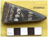 Fully ground with a pointed end. Margins are thick, flat, smooth and tapering towards the butt. Ventral face is slightly convex and dorsal remains flat. Cutting edge is broken. The cutting edge retains notched marks and are uneven from both the directions.