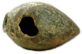 | Description / विवरण | Terracotta Plumbob with pointed bottom and flat projected top, it has two circular holes, one at the top and the other on one side so as to pass through a slender thread. |