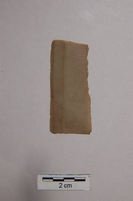 | Description / विवरण | rectangular shape object with parallel side. Surface is slightly raised with prominent middle rib. Two sides are retouched and sharp. Opposite side is plain and smooth. |