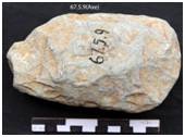 Shape is obtained by irregular flaking all over with a big patch of cortex on the dorsal surface. The edge is thick and convex, butt narrow and concave. Margins are straight and blunt. Irregular in median and triangular in longitudinal sections.