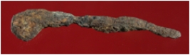 | Description / विवरण | Trench WAM8, surface. It s a nail made of iron. It has broad tip and other end is almost pointed. Uneven shaped, rusted, damaged and appearance is rusty brown. |