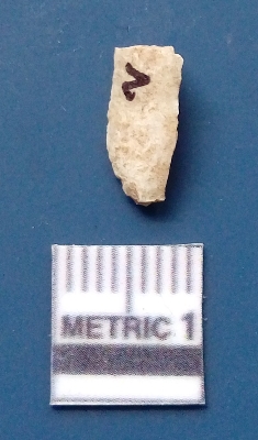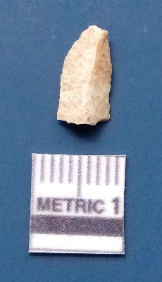 | Description / विवरण | It is a blade fragment. The ridges are clearly seen on the dorsal surface and the ventral surface is plain. The sides are sharp. It is white in colour and is triangular in cross -section. |