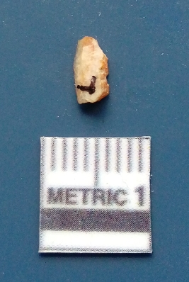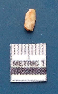 | Description / विवरण | It is a blade fragment. The ridges are clearly seen on the dorsal surface. The ventral surface is plain. The sides are sharp. It is reddish white in colour and is triangular in cross -section. |