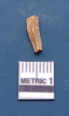 | Description / विवरण | It is a blade fragment. It is brownish in colour. The ridges are clearly seen on the dorsal surface. The sides are sharp and the ventral surface is plain. It is triangular in cross - section. |