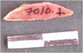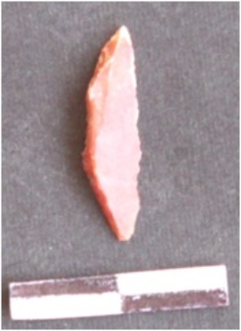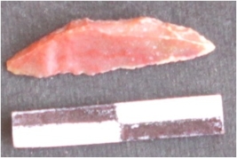 | Description / विवरण | Lunate. The sides are sharp and retouched. The ventral surface is plain. It is red in color. |