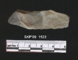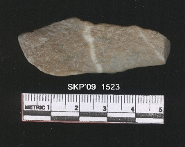 | Description / विवरण | Chert blade, it is rectangular in structure. It is triangular in cross section, the ventral side is plain, it couldn t properly make a blade. |