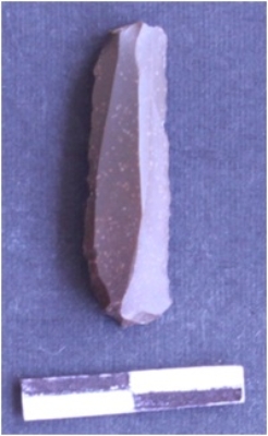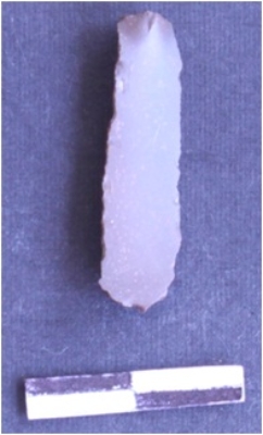 | Description / विवरण | It is a chert blade. The ridges can be clearly seen on the dorsal surface. The sides are retouched and are sharp. Bulk of percussion can be seen an the ventral surface the ventral surface is plain. |