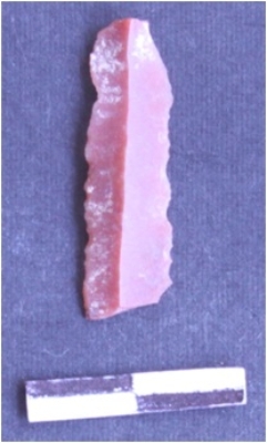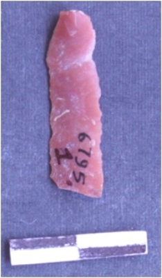 | Description / विवरण | It is a chert blade. The ridges can be clearly seen an the dorsal surface. The sides are sharp and retouched. Bulb of procession can be seen on the ventral surface. It is broken and is triangular in cross section. The ventral surface is plain. |
