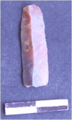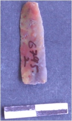 | Description / विवरण | It is a chert blade. It is broken and triangular in cross section. The sides are sharp and retouched. The ridges are can be seen on the dorsal surface. The ventral surface is plain. |