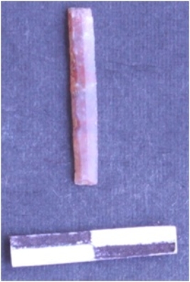 | Description / विवरण | It is a chert blade. It is broken, long and rectangular in structure. The ridges can be clear seen on the dorsal surface. The sides are sharp and retouched. |