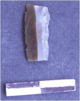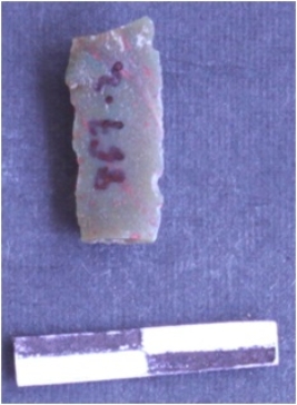 | Description / विवरण | It is a chert blade. The ridges can be clearly seen on the dorsal surface. The sides are sharp and retouched. The ventral surface is plain. |