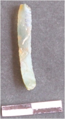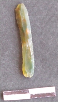 | Description / विवरण | Blade. The sides are sharp and retouched. The ridges can be seen clearly. The bulb of percussion can be seen clearly on the ventral surface. |