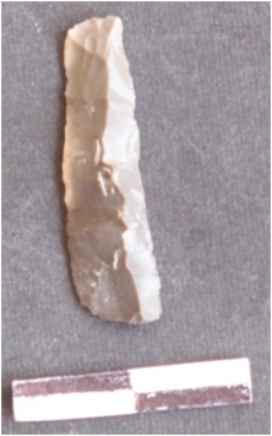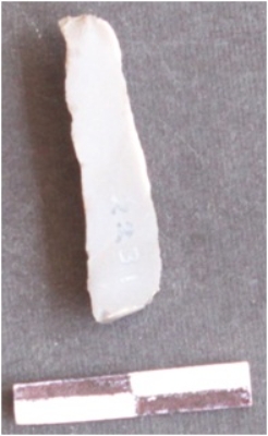 | Description / विवरण | Blade. The sides are sharp and the ridges can be seen. It is broken and the bulb of percussion can be seen on the ventral surface. |