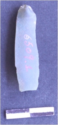 | Description / विवरण | It is a blade. It is broken and triangular in cross section. The ides are sharp and retouched. The ridges can be seen on the dorsal surface. The bulb of percussion can be seen on the vernal surface and the ventral surface is plain. |