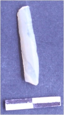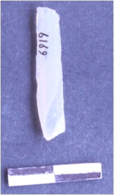 | Description / विवरण | It is a blade. It is broken triangular in cross section. and white in color. The ridges can be clearly seen on the dorsal surface and the sides are sharp and retouched. The ventral surface is plain. |