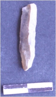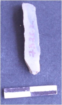 | Description / विवरण | It is a blade. The ridges can be seen on the dorsal surface. The sides are sharp and retouched. It is broken and triangular in cross section. The ventral surface is plain. |