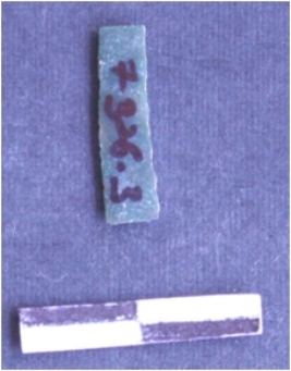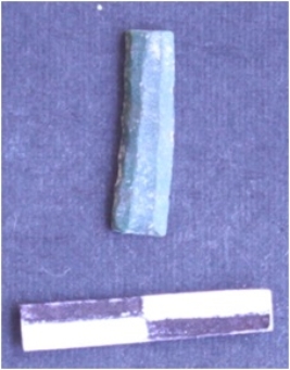 | Description / विवरण | It is a blade. The ridges can be seen clearly seen on the dorsal surface. The sides are sharp and retouched. The ventral surface is plain. It is broken and trapezium in cross section. |