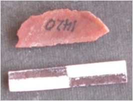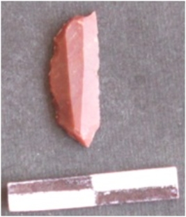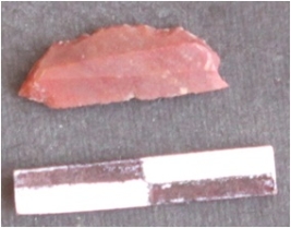| Description / विवरण | Lunate. The sides are sharp and retouched. The ridges can be clearly seen. The ventral surface is plain. It is red in color. |