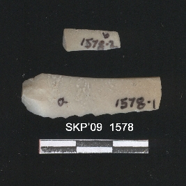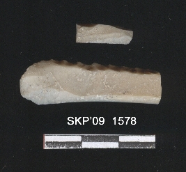 | Description / विवरण | Broken chert blade. The ridges can be clearly seen. The retouching can be seen on one side. Trapezium in cross section. |