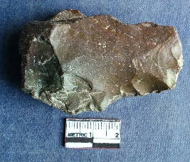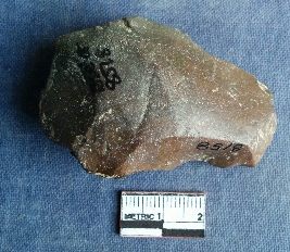 | Description / विवरण | This is a stone side scrapper of chert stone, flake has been removed from all sides. One side is tapered and retouched. One median ridge on oen side surface. |