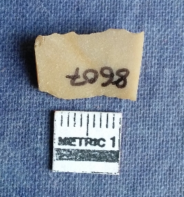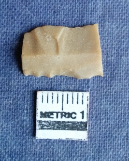 | Description / विवरण | This is a rohri chert blades fragment with broken ends, triangular cross section with a median ridge on the dorsal side, ventral side shows a bulb of percussion. One margin shows retouched dention lation marks and the other margin is sharp. Smooth surface. |