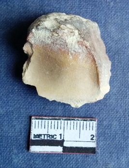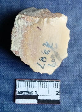| Description / विवरण | This is a chert stone scrapper, a little portion is covered with cortex. Flakes has been removed, scrapped and retouched side margins. |