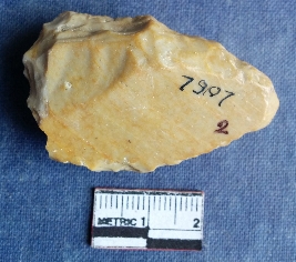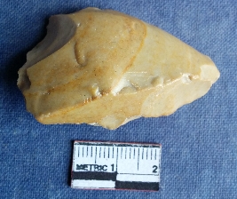 | Description / विवरण | This is a chert stone scrapper, flakes removed and retouched. Abraded surface, sides shows scrapped marks. |