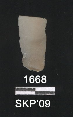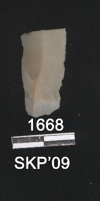 | Description / विवरण | This is a chert blade with one broken end and the other end is bended a little with broken roundish end flaked surface. Triangular cross section on the broken end side. Sharp fine margins with a far chert marks and flaked ribs. |