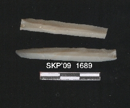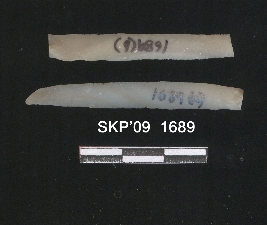 | Description / विवरण | Chert blade fragment, broken out the distal ends. Flake seems on the surface, uses ware marks on the lateral margins, percussion on the ventral side opaque. |