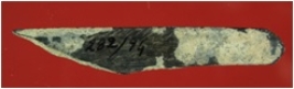 | Description / विवरण | Trench WD 2, Qdt 2, layer 1, depth 5-11 cm It is a piece of blade made of bone. It is narrowing towards the tip making it pointed. Surface is rough with dark brown appearance. |