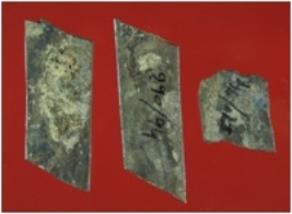 | Description / विवरण | Trench WD 2, Qdt 2, pit 2 SB SH, depth 33-53 cm These are three broken pieces of blade made of bone. Rough surface with deposition of dirt. Dark brown in appearance. |