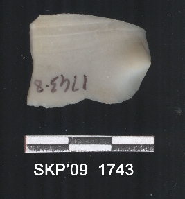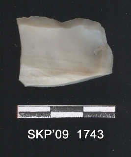 | Description / विवरण | Broken chert blade. The ridges can be seen clearly. The sides are retouched. It is trapezium in cross section. The bulb of percussion can be seen. |
