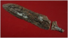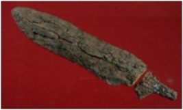 | Description / विवरण | Trench WAP 13, Qdt 4, layer 21, depth 450 cms It is a broken spear head made of iron. Badly rusted. It has sharp tip and double edged. |