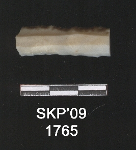 | Description / विवरण | This is fragment of a chert blade, both ends with trapezium cross section. denticulated marks on the lateral margins, flake ridges on the dorsal side, flat on the ventral side. Greenish in color. |