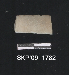 | Description / विवरण | Broken chert blade. The sides are retouched. The ridges can be clearly seen. it is triangular in cross section. The ventral surface is plain. |