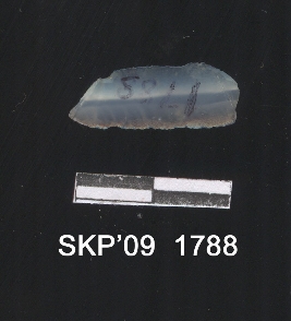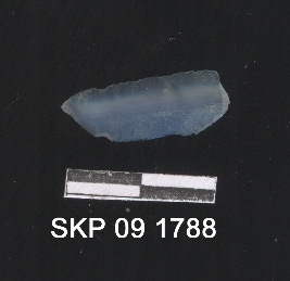 | Description / विवरण | Broken chalcedony blade. It is retouching in structure. It is triangular in cross section. The ridges can be seen clearly. The retouching can be seen on both sides. |